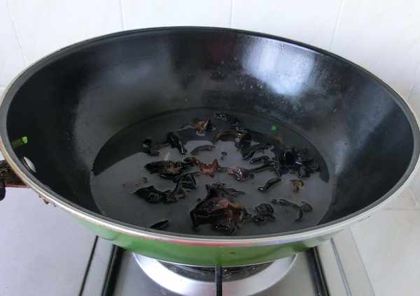 3.木耳放入滚水中焯水。