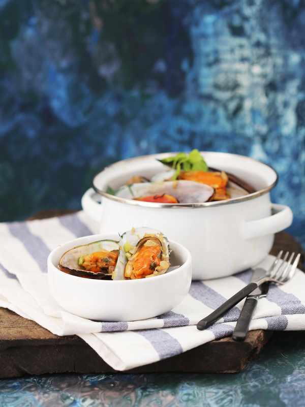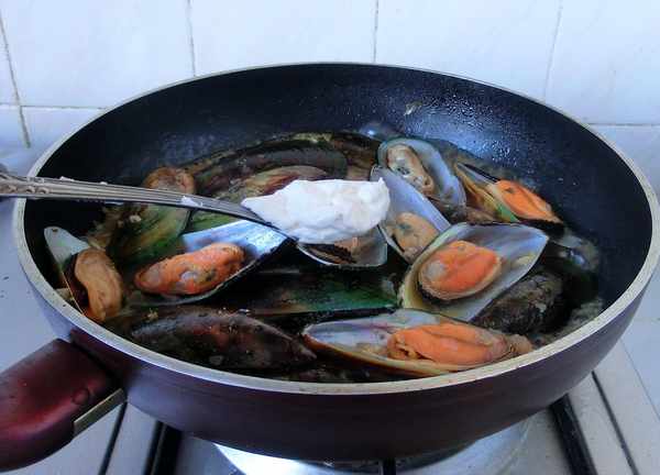 7.青口壳都展开后,代表熟了,按自己口味加盐、胡椒粉、淡奶油,给汤汁调味。