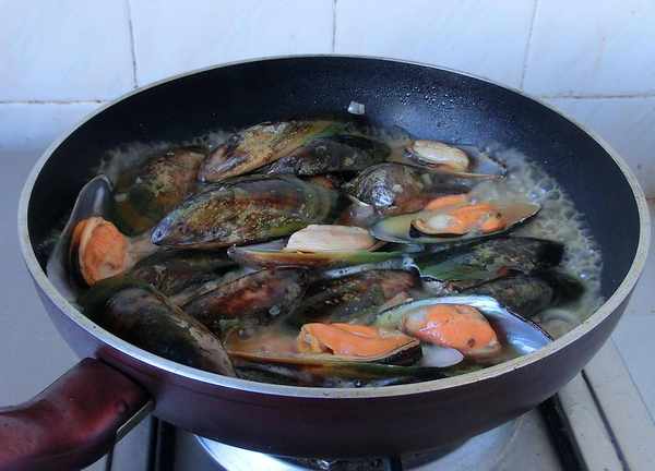 6.拌匀后加入洗干净的青口,焖3分钟左右,期间搅拌几次。