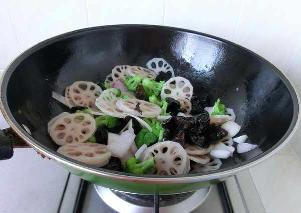做法:1.木耳泡发,洗净,撕小朵;西兰花撕小朵;洋葱切块;藕去片,切片。