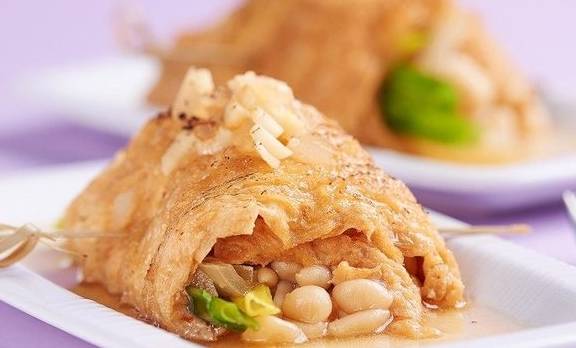 PS:如担心豆包卷在煎煮时会鬆散开,可利用竹籤串起再煎,摆盘时再取出即可。