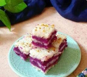 做法:准备好食材。紫薯蒸熟后碾成泥。加入枸杞和葡萄干。糯米加水上锅蒸熟。保鲜盒刷上油,将蒸好的糯米倒入,用勺子抹平。加入紫薯泥压平,再铺一层糯米,直至铺完。盖上盖子,放入冰箱冷藏1-2小时。脱模。浇上桂花蜜切块即可。