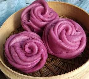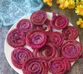 做法:食材备好,紫薯,面粉,酵母粉,白糖,加适量牛奶揉成光滑的面团,饧发15分钟,把饧发好的紫薯面团擀成大片厚度大约5㎜,用水杯刻出圆片。刻好的圆片,每5个一组排列组合,上下对折成半圆形。从一头卷到另一头,玫瑰花做好了,最后一步上锅蒸熟就可以吃了。