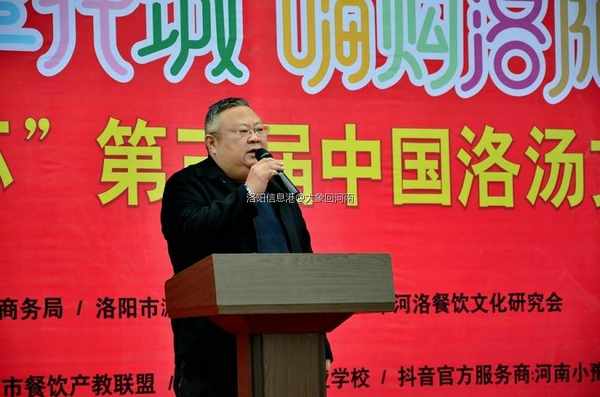 开幕式首先由河南省餐饮与住宿行业协会副会长、注册中国烹饪大师、洛阳市河洛餐饮文化研究会会长王起畅先生致辞:尊敬的吴启超市长,各位领导,各位来宾,大家上午好。春日春时春水流,春鸟登与春枝头。在这个热情洋溢的日子里,我们迎来了中国洛汤第三届文化节的开幕庆典,在此,我谨代表洛阳市河洛餐饮文化研究会全体同仁,向今天能够出席本次庆典的各位嘉宾领导表示热烈的欢迎和衷心的感谢。疫情的三年给洛阳市各个行业带来了极大的困难,餐饮界更是举步维艰。那么,疫情过后的餐饮构造局面将告别暴利化的经营,进入微利化的经营,也就是平民化的销售。我们洛阳的汤正符合这个契机。回归原点。本次活动直接参与参展的商家有30余家,另外在市内及九县六区互动的汤家有180家。于24号上午九点58分有大家发微信形成微信矩阵,达到万人喝汤的局面。在这里,我在向筹备当中,市里各级领导的大力支持以及参参展汤家舍小家为大家的优良品质。表示感谢,另外还要向。新明珍食品有限公司的冠名表示,感谢还要向一旅科技梨落厨房设备,东古一品轩,天禾调味品表示衷心的感谢。同时我在这里呼吁洛阳市社会各界人士,大家齐心协力,为打造洛汤宣传,洛汤研究,洛汤提升,洛汤真正的把洛汤打造成洛阳的一张饮食名片,而不忘初心,砥砺前行。洛阳的汤是一种情怀,是我们洛阳饮食文化当中一个精神层面的体现。他散发的热情传达了友谊。何以解忧?唯有杜康要解乡愁,必喝洛汤,最后,祝本次活动圆满成功,并向在座的各位领导致以美好的祝愿,祝大家事业蒸蒸日上,家庭幸福安康,谢谢大家。