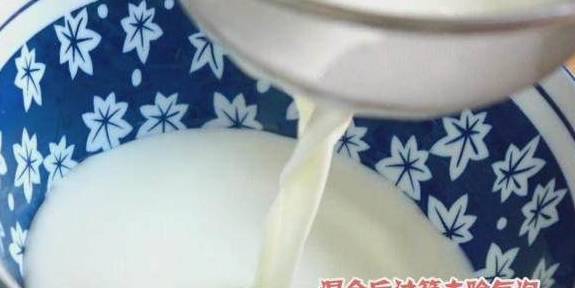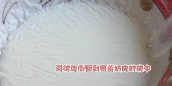 6延碗边倒回留着奶皮的碗中,奶皮浮起
