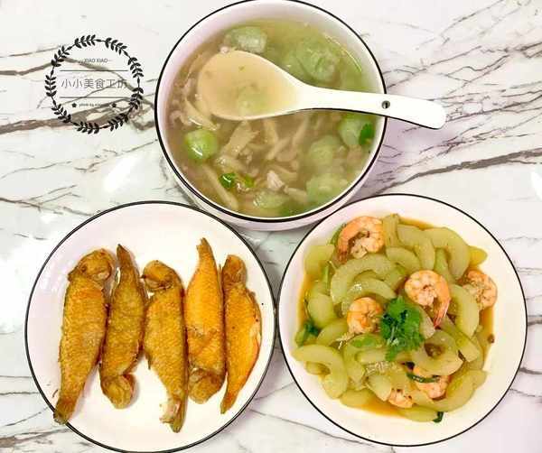 炸鱼,家人非常喜欢的一道菜品,鱼肉外酥里嫩,提前腌制后再炸,吃起来很有滋味。青瓜炒虾仁,黄瓜需要先去皮,然后用盐腌制片刻,这样炒制时才不会出水,吃起来也更加爽脆,虾仁炒熟后放入青瓜块,继续翻炒片刻,最后加入生抽和食盐调味即可。瘦肉汤是用生滚的做法,先将瘦肉片腌制片刻,然后放入热水中滚熟,加入适量青瓜和食盐调味即可。