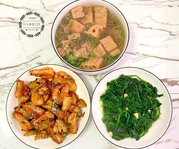 麻辣香锅,也是一道超级下饭菜,准备自己喜欢的食材,可以用炸制的方法也可以用焯烫的方法,先将食材处理成熟,然后锅中下入麻辣香锅底料或者火锅底料,炒化后放入所有食材翻炒均匀即可。蒜蓉菠菜,一道清爽的小菜,菠菜建议提前焯烫去除草酸,然后切碎搭配蒜蓉翻炒片刻,加入食盐拌匀即可。排骨莲藕汤建议用砂锅小火慢炖,汤头会更鲜美。