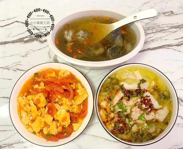 番茄炒蛋,一道没人会不喜欢吃的菜品,酸酸甜甜的口感让人百吃不厌。酸菜鱼的做法跟水煮鱼差不多,就是把食材换一下就可以,吃起来酸爽可口,也是家人最爱的下饭菜之一,最后是乌鸡汤,这个提前放入电饭煲中预约制作,炖煮出来的汤品鲜美又滋补,喝起来顺口又舒服。