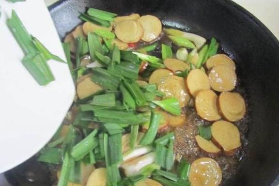 步骤七:将锅里面的香干烧上一会,再把之前切好段了的青蒜都倒到锅里面,用小勺子将它们拌一拌,炒一炒