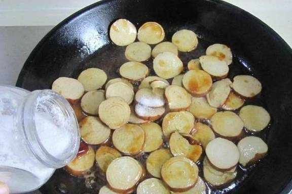 步骤五:将耗油在锅里面炒化往后,再向它们表面撒一些盐,将里面的咸味调整一下