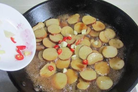 步骤六:盐倒进去之后,给锅里面的香干加一些净水烧一烧,将它们烧到了冒泡后,把大蒜和红尖椒全都放进去煮香