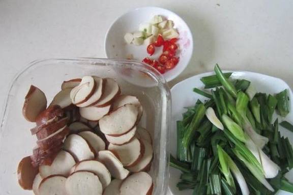 步骤一:我们将全部的东西都冲洗洁净后,先把青蒜切成段状,再将香干切片,大蒜和红尖椒全都切段然后放一边