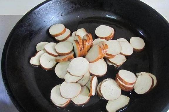步骤二:将香干片切好往后,先在锅里面倒一些油,将它们烧热了再把香干放到里面去,将其炒一炒