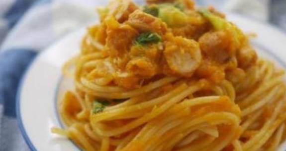 第二步,在南瓜还没有蒸熟的时候,我们先来准备培根。把培根片切成小块。等到南瓜蒸好后,放进料理机里面打碎。之后准备煮意大利面。因为这道面食我们选用的是天使面,这种面比较细,所以只需要再开水中煮2分钟就可以了。在煮面的过程中我们加一点点盐,这样面条就会比较入味了。