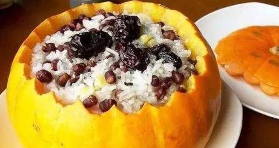 备料:南瓜2个,大米30克,红豆30克,葡萄干30克,蜂蜜1汤匙,小米30克,薏米15克,绿豆15克。