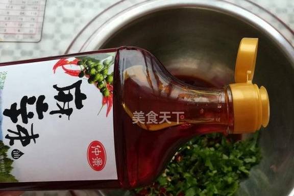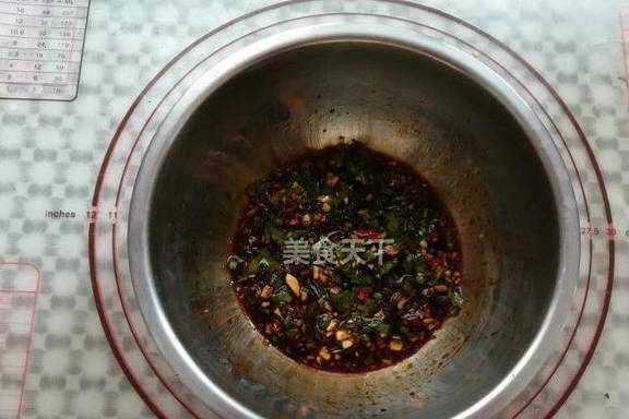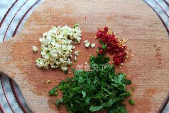 12.取干净的盆子放入蒜米,辣椒和香菜,加入适量的麻辣油。