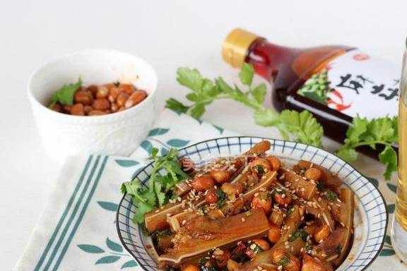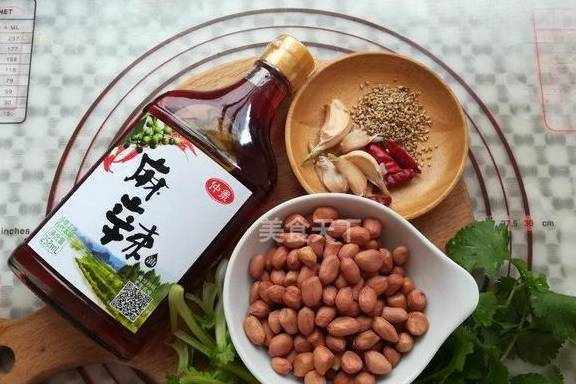 猪耳朵350克、料酒25克、老抽30克、葱花10克、生姜10克、八角6个、花生米100克、香菜2棵、蒜米5瓣、辣椒4个、芝麻适量、生抽50克、麻辣油适量