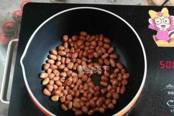 14.花生米放入锅里炒热后加适量的油爆出香味。
