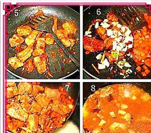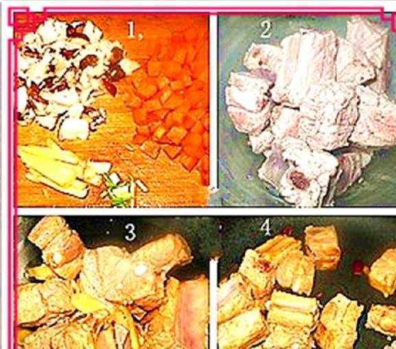 把胡萝卜和香菇切成丁点。葱花。排骨过一次水,去掉味道,水倒掉,倒一点点油倒锅里炒下,下料酒,生抽,姜丝,炒到两面都是金黄色加冰糖和老抽。