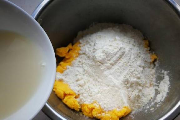 1、玉米粉先用热水搅拌成絮状,待到不烫手时放入面粉,加入酵母水(酵母放入温水中搅拌均匀后静置几分钟),混合成一个面团。
