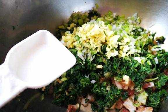 3、发酵面团的时候可以来调馅:猪肉切成小块用胡椒粉和生抽腌制15分钟,放入焯水后剁碎的荠菜,放入大葱末和生姜末,调入盐,蚝油,花生油顺一个方向搅拌均匀。