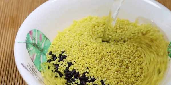 将黑米和小米倒进碗里,加入清水浸泡和清洗。