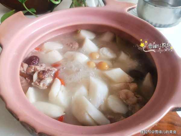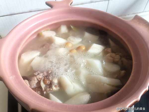 第七步:放入山药,继续炖至山药熟透,加盐和味精提味。山药不要太早放,最后放炖熟就可以,太早了容易炖烂,汤就不好看了,也会影响口感。