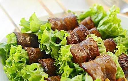 做法:准备材料。将五花肉片撒上葱姜片、花椒、八角、倒入烤肉酱,少许生抽加盖保鲜膜,放到冰箱腌制1小时。将腌好的五花肉沥净水分,用吸油纸拭干,煎锅中放入少许油,煎制。注意翻面,煎至肉片变色,肉质收紧即可。将腌肉的料汁滤除香料和葱姜片备用。烤盘中铺锡纸,将五花肉平铺到烤盘上,刷上一遍料汁,撒上适量孜然粉。烤箱调制160度,烤大约15——20分钟,中间翻一次面,刷上料汁,撒孜然粉。烤至金红色,卷上洗净的生菜,用竹签串上即可。