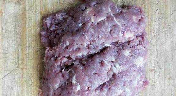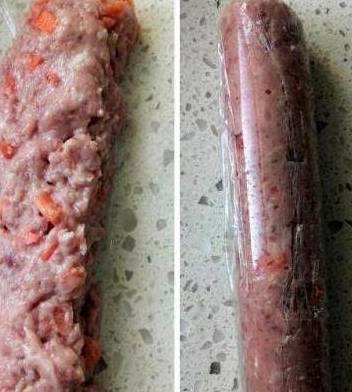 在保鲜膜上放入适量的肉泥,用保鲜膜裹自己喜欢的样子