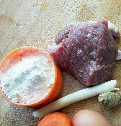 猪肉250g淀粉50g胡萝卜一小段(玉米粒也可)蛋清一个葱姜适量