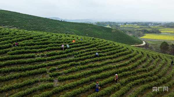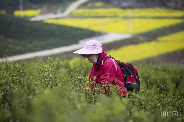 3月23日,在江西省九江市都昌县苏山乡合岭村生态茶园,采茶工在采摘茶叶(央广网发 傅建斌 摄)