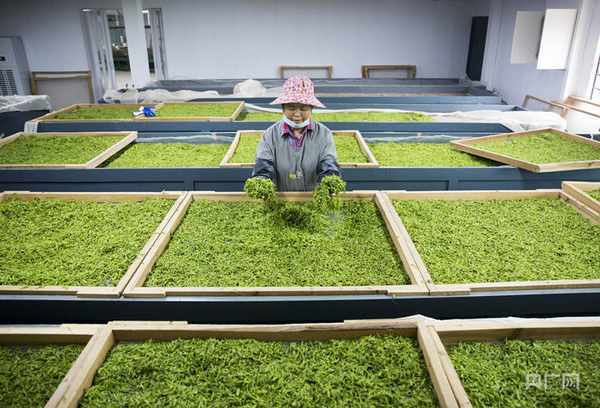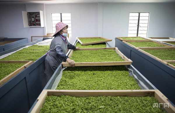 制茶工人在车间内翻晒茶青(央广网发 傅建斌 摄)