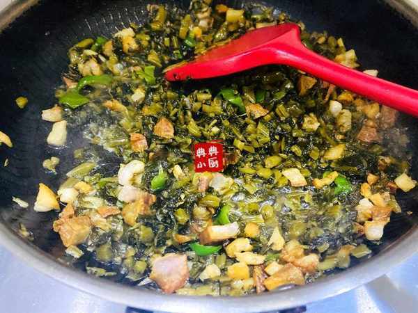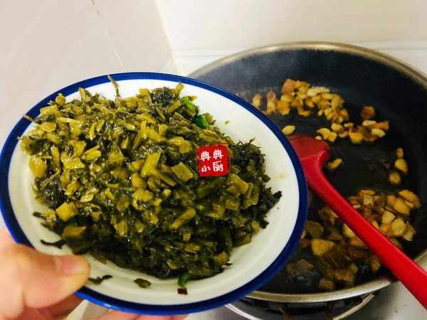 把酸菜倒进去。这酸菜是妈妈腌制的,腌的时候就已经切好了,所以不需要另外加工了。