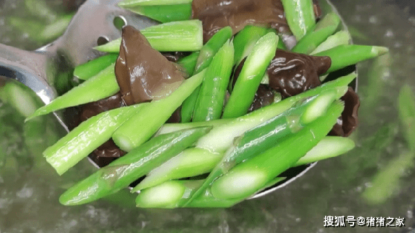 5.锅中烧水,加入少许油,把切好的芦笋和木耳焯一下水,水烧开以后烫1分钟左右,捞出来控干水分。