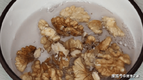 4.准备几个核桃,把核桃仁掰出来,放入一个小碗中,加入清水浸泡一下,去除一部分的青涩味。