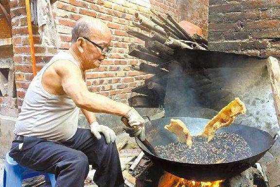 之后还没完,这些猪皮要晾晒一到五天后,再去毛、洗净,之后要再熬煮、晾晒!终于可以开始最后一步,炒猪皮了!利用沙子的导热性,可以让猪皮受热均匀,这样炒出来的猪皮又脆又香,非常好吃。
