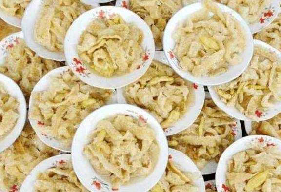 当年的潮汕地区,是重要的港口,歪果仁吃肉不吃皮,于是低价的猪皮就从越南运到了这里。猪皮要做成菜,还是需要一系列的加工的。先将整块的猪皮熬煮十多分钟,再浸泡在冷水中,这样可以让猪皮变得脆脆的。还有很重要的一步,就是刮油,将猪皮上多余的脂肪刮走,这样等会儿炒的时候才不会爆油。
