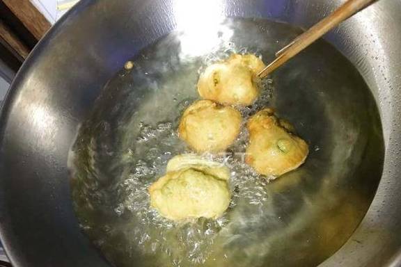 12.将面糊一股脑的在同一个位置,不要移动勺子,倒入油锅里。