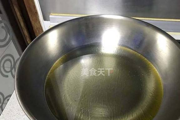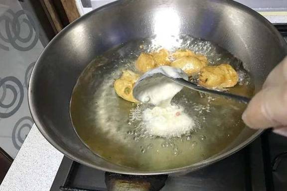 10.锅里热油,油没有气泡了油温大概在170度左右,开始炸面团。