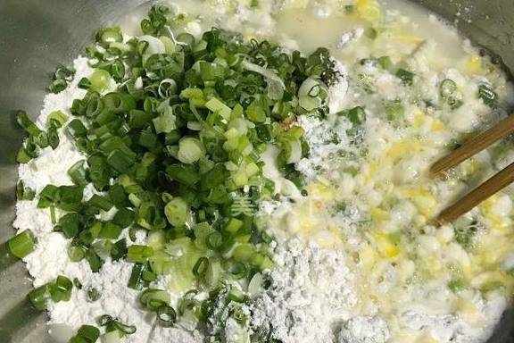 11.用一个小勺子舀一勺面糊,用筷子刮掉勺子底下的多余面糊。
