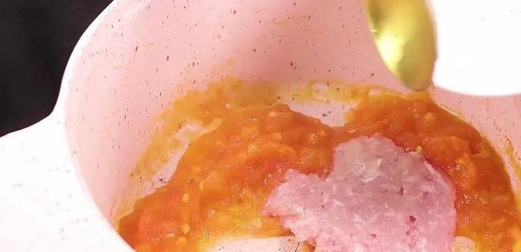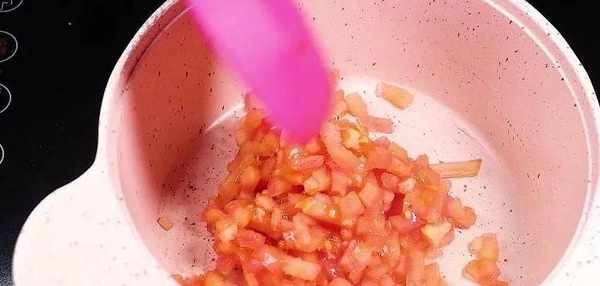 奶锅倒入少量食用油和西红柿碎丁,翻炒至西红柿软烂。