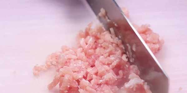 猪里脊切成薄片,再切成肉丁,然后剁成肉泥。