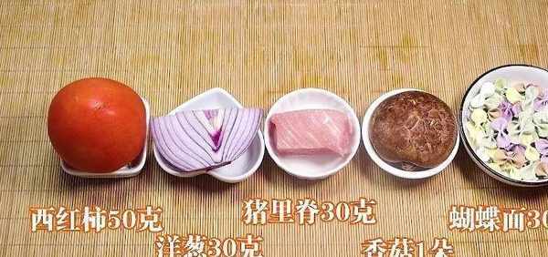 今天跟大家分享这道蝴蝶面食,妈妈选择市面上吸引人的蝴蝶面作为主要的食材,这样能够更加吸引宝宝呢,同时搭配各种食材,比如维生素丰富的西红柿,清除体内氧自由基的洋葱,促进宝宝身体的新陈代谢功能,加上猪里脊和香菇,让这道辅食变得更加美味可口。