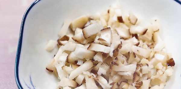香菇切成薄片,再切成香菇丁,放进碗里备用。