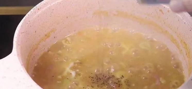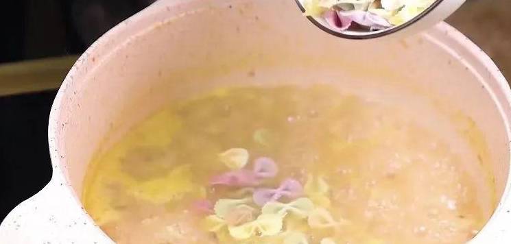 倒入蝴蝶面,煮7到8分钟,煮至汤汁浓稠。