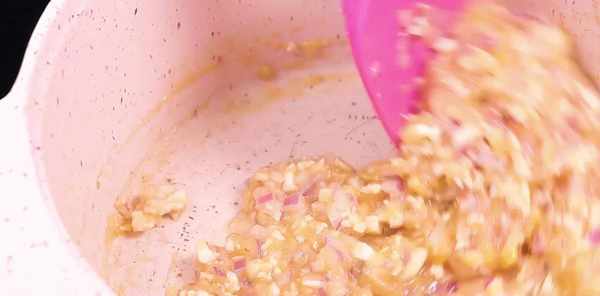 接着,倒入香菇丁和洋葱丁,翻炒2分钟。
