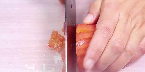 西红柿对半切开,去蒂后,切成薄片,再改刀切成碎丁。