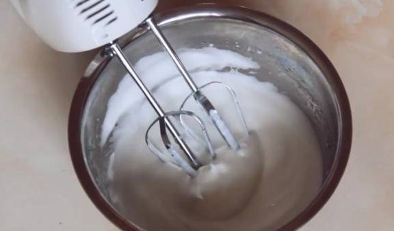 步骤5、蛋白打发到出现小泡泡时候,加入10克白糖,接着用中速打发到蛋白表面有纹路,再加入10克白糖,这时候转低速打发蛋白霜到提起搅拌器有鹰嘴弯钩时候停止。