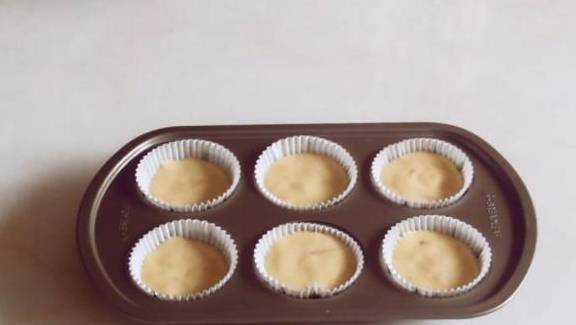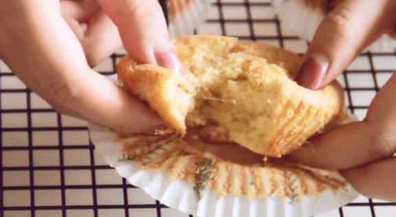 步骤7、烤箱预热到170度,把面糊倒入马芬纸杯后,在桌上磕2下,排出里面的大气泡,最后放入烤箱中烘烤18分钟。这一道松软美味的拔丝蛋糕就制作完成了,用手轻轻掰开就能看到里面的肉丝。(马芬纸杯里的面糊一般加到8分满就可以了,太少会导致蛋糕膨胀不起来,太多会导致蛋糕表面开裂和溢杯等现象)