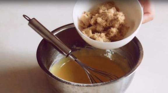 步骤3、在面糊里倒入50克肉松,用打蛋器搅拌,让面糊和肉松充分混合后,放一旁备用。(喜欢吃肉松的可以多下点,但是肉松很咸,要记得减少食用盐的使用量,而且搅拌的时候要让肉松充分混合均匀,避免肉松结球做不出拔丝的效果)